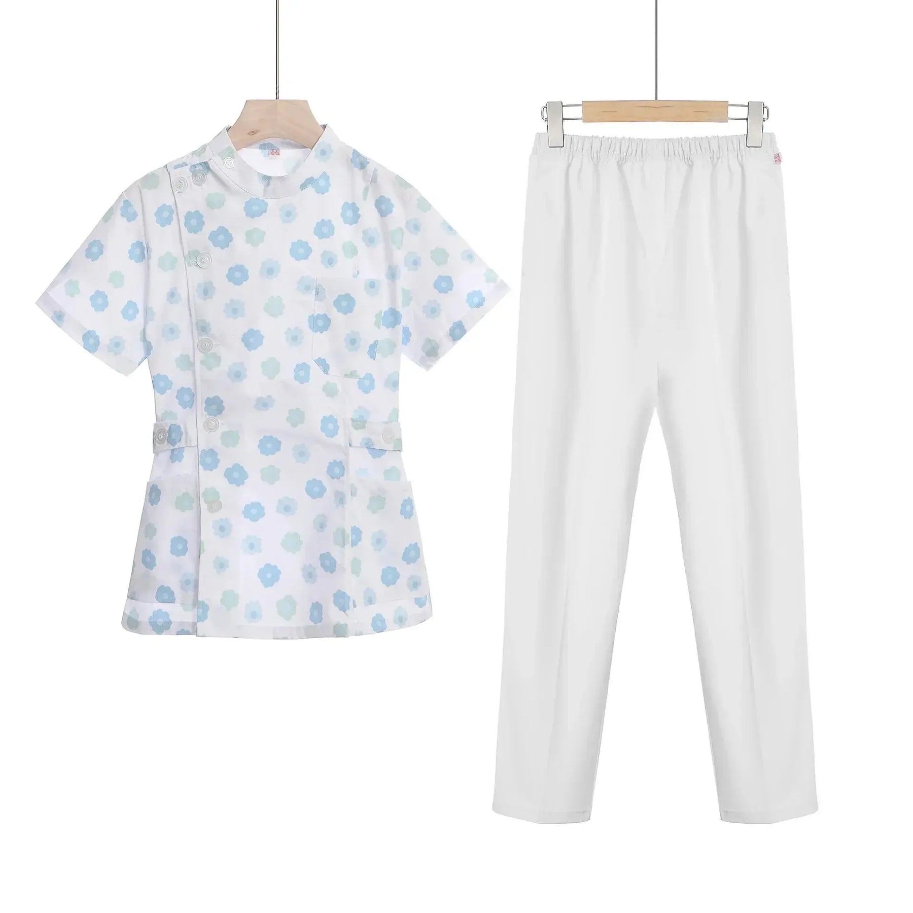 Conjunto Scrub Blanco, Rosa y Azul para Mujer "BlushCare Elite" – Uniforme De Enfermera Corto de Dos Piezas con Comodidad y Ajustable