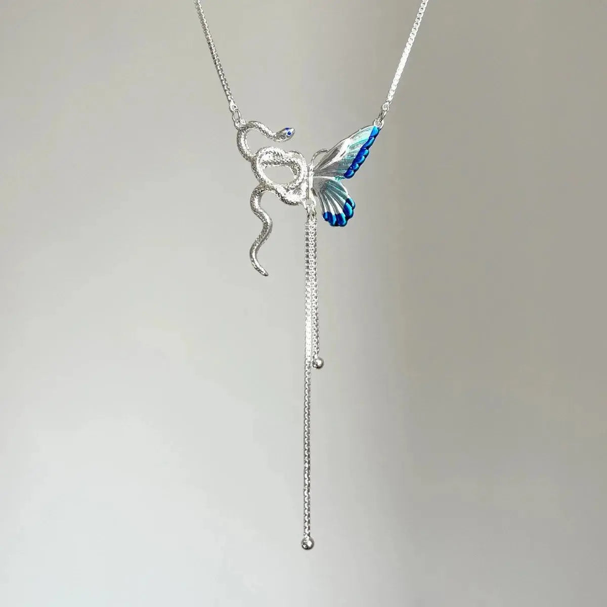 Imagina un collar que despierta tu esencia salvaje y transformadora, donde la delicada mariposa se entrelaza con la serpiente audaz en una gargantilla con borlas que te hace sentir misteriosa y empoderada, como si llevaras un talismán secreto que eleva tu aura en cosplays épicos o looks diarios punk Y2K.